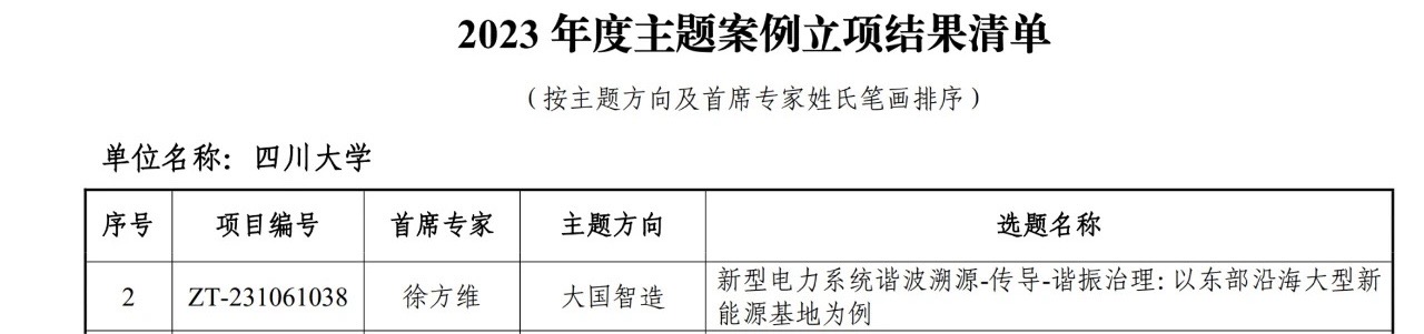 近日,教育部学位与研究生教育发展中心公布了2023年度主题案例立项名单。公司徐方维教授担任首席专家申报的“大国智造”主题案例《新型电力系统谐波溯源-传导-谐振治理:以东部沿海大型新能源基地为例》成功立项。