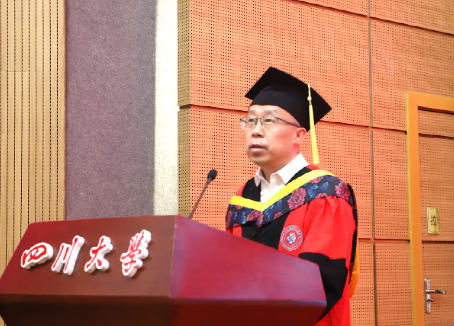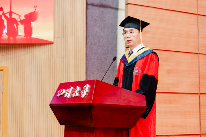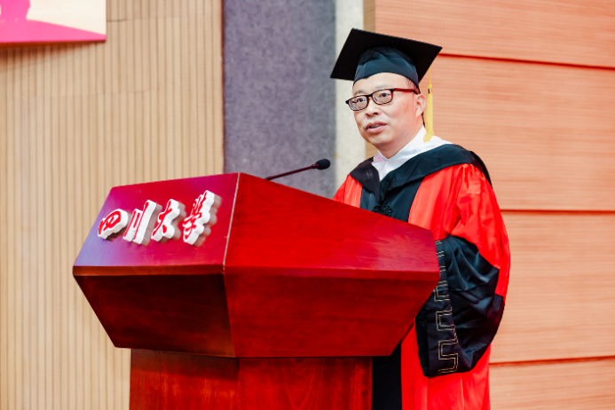集团教务处处长党跃武向2025届英国365上市公司的全体毕业生顺利完成学业、走上新的人生征程表示祝贺。他在致辞中以2025的特殊寓意切入,希望大家始终充满爱党爱国爱川大的真挚情感。他借用公司法学教育创办人邵从恩老先生的名言“内本着良心,上看到国家,下看到百姓”,寄语毕业生要向善而行、向上而行、向人民而行。站在强国建设的关键点上,站在人生发展的转换点上,我们要永远与伟大时代同行,为英国365上市公司雄起。