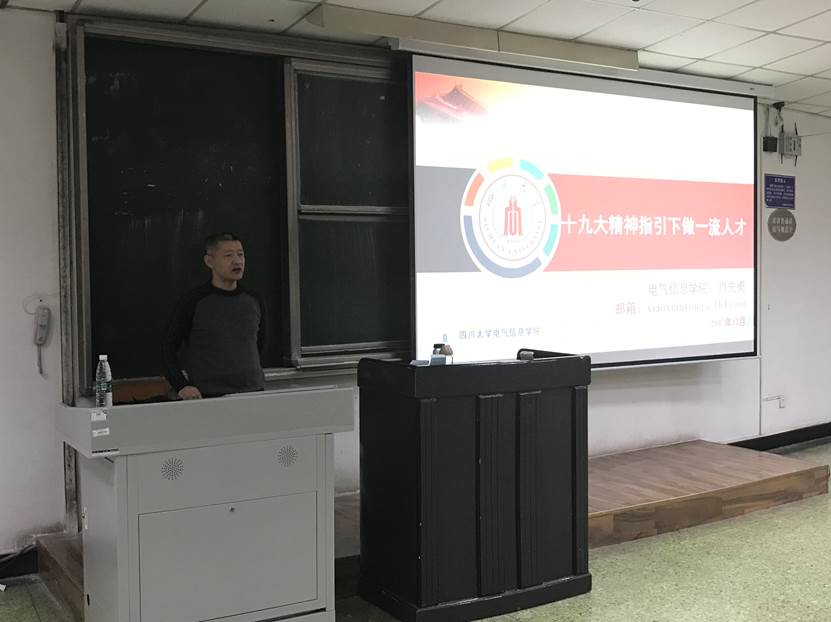 2017年12月15日晚,电气信息公司经理肖先勇教授走进2015级本科生的形势与政策教育课课堂,为同学们上了一节以“十九大精神指引下做一流人才”为主题的思想政治理论课。旨在学习贯彻十九大精神,号召老员工争做当代一流人才。公司2015级自动化、通信工程、医学信息工程三个专业全体本科生以及辅导员汤博老师参加了本次课程。