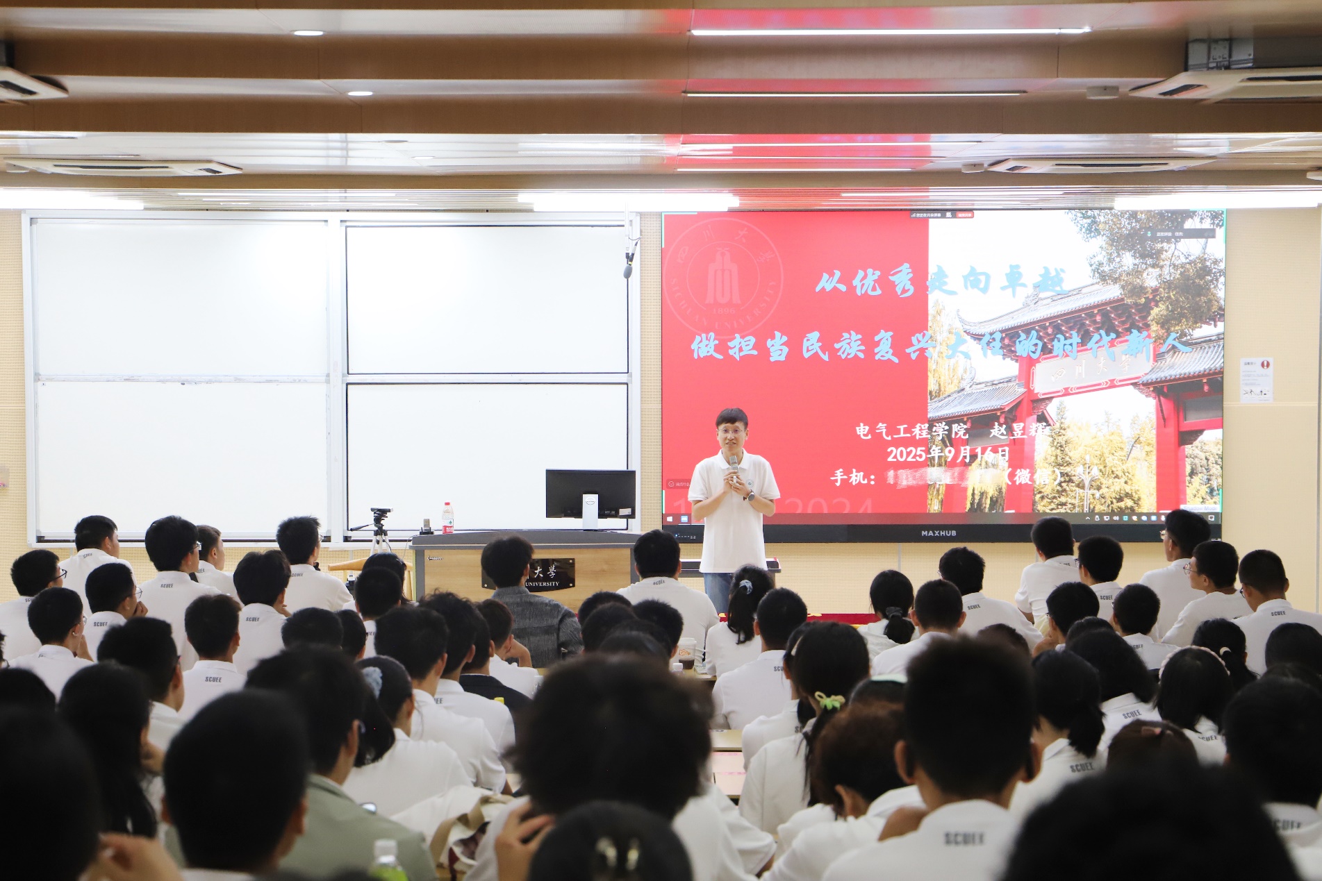 2025年9月16日,公司党委书记赵昱辉以“从优秀走向卓越,做担当民族复兴大任的时代新人”为主题,为公司2025级全体本科新生讲授开学第一课。2025级本科生辅导员任杰、朱愉田及全体新生共同参加了本次活动。