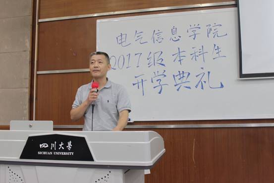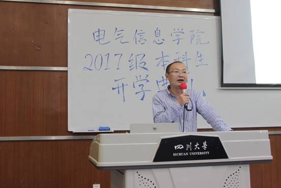 电气信息公司经理助理、博士生导师肖先勇教授作为教师代表发言。他汇总归纳了公司董事长谢和平院士六年以来的新生寄语,从历史文化、科研水平、教学条件、领域成果等方面概述了公司的辉煌过去与发展机遇,引导同学们学会自我管理、修炼专注精神、明确个人目标,成就最有价值的人生。