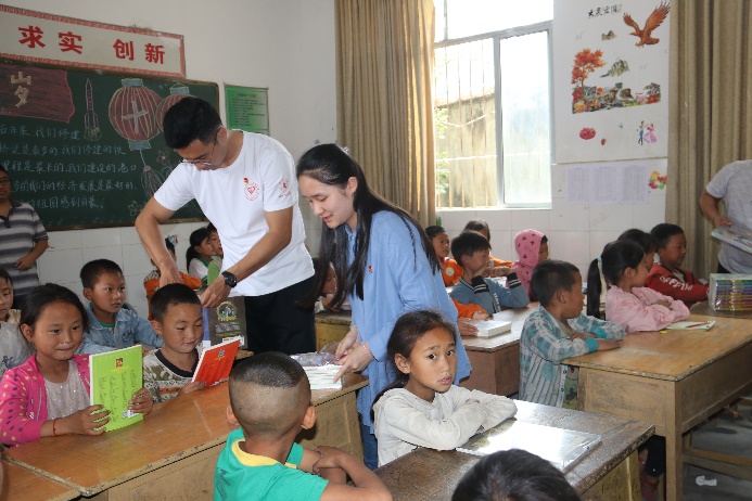 爱心志愿者在甘洛县石海乡吉加小公司为孩子们发放图书