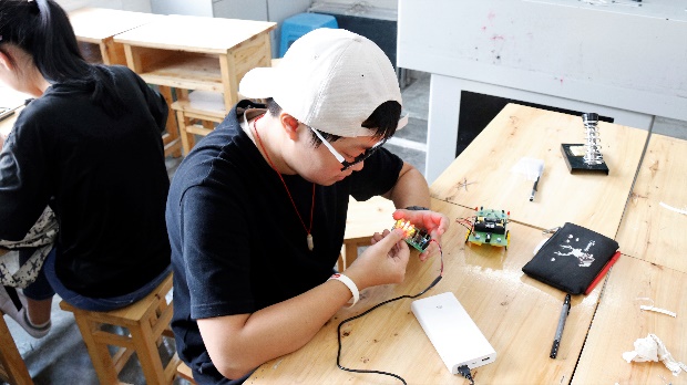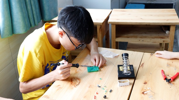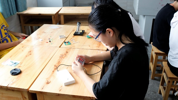 8月9日上午8:30,别开生面的一天在精彩纷呈的实践课程中开始了。二班和三班是电焊课,在电焊之前,主讲队员首先说明了各个元器件的名称、功能及焊接方式。待队员讲解完后,同学们跃跃欲试,开始了方块灯和梦幻彩灯的焊接。焊接过程中,助教始终在旁边为同学们答疑解惑,并对一些操作进行示范和辅助。员工们完成焊接后,队员们会对方块灯和梦幻彩灯进行通电发光检验,发现员工作品中出现发光间断,声音过小等问题时,主讲队员和助教会针对该种情况发生的原因进行解答,并指导员工对作品进行相应的调整。