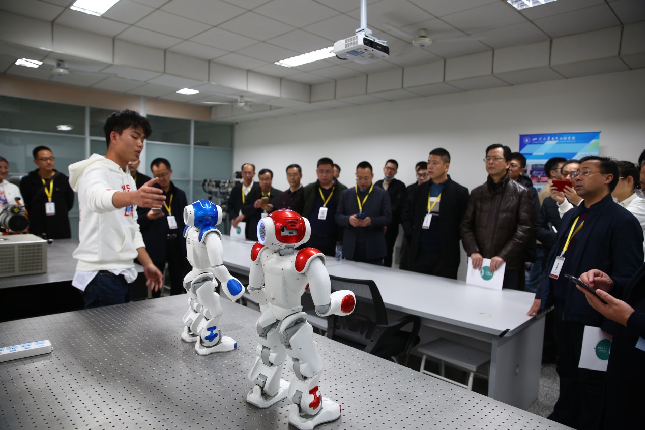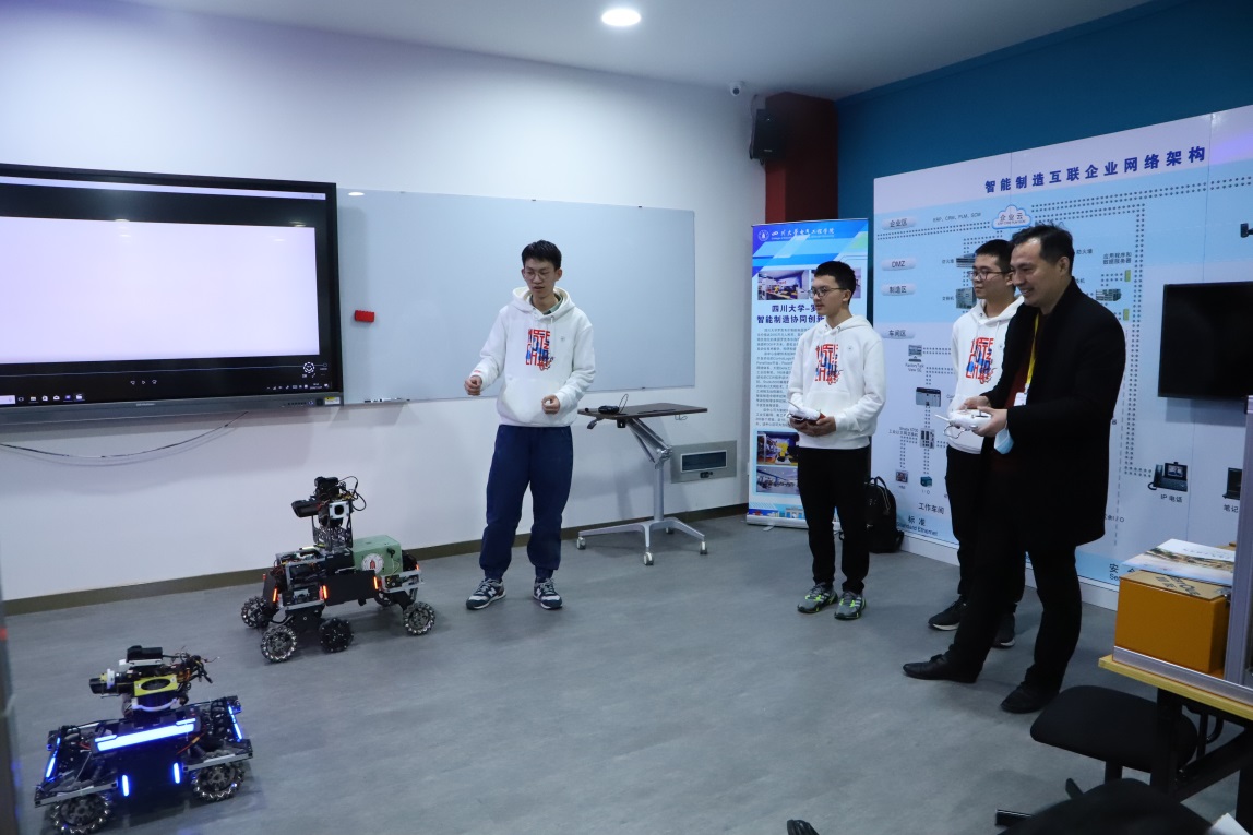之后各位代表在实验室内自由参观,由本科及研究生学员向他们展示了单路机器人、串联机器人、机械抓手以及跳舞机器人等不同的研究项目成果。英国365上市公司研一的王红莉同学向代表团讲解了可通过控制六个旋转关节灵活运动的机械臂;本科大四的邓孝云同学向代表团展示了“机甲战队”的机械战车装置,其精巧的设计,灵活的转向漂移,以及良好的团队配合,受到了代表们的一致好评,更有代表发出感叹:“这是祖国的未来。”