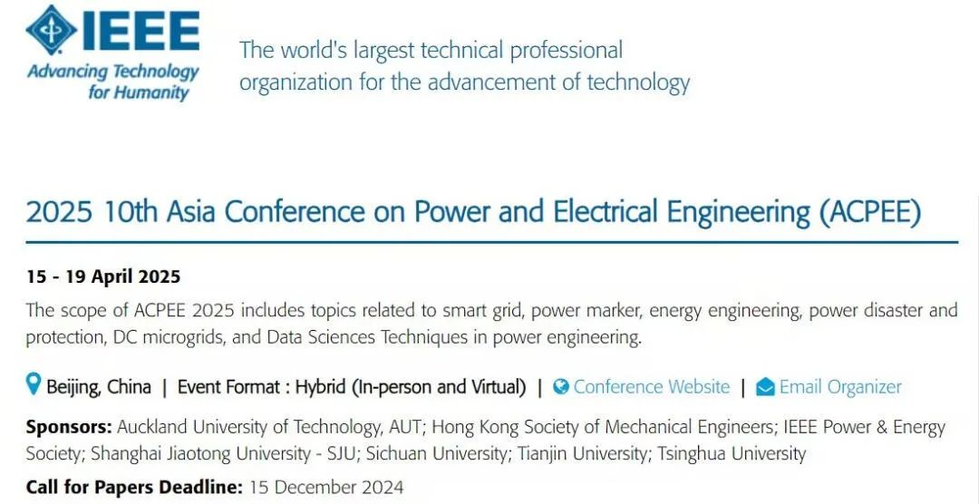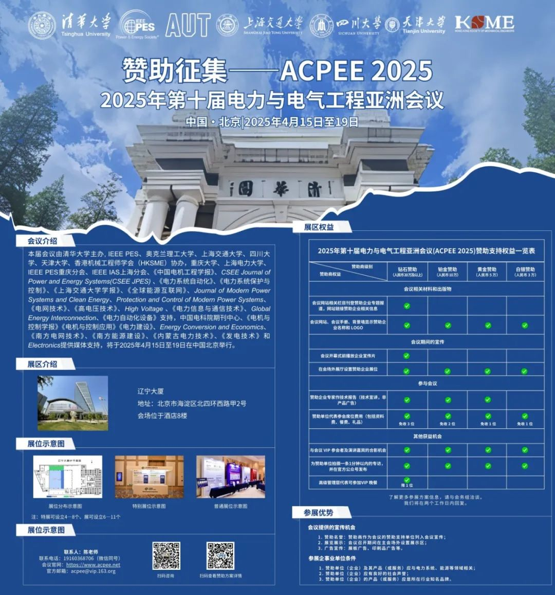 2025年第十届电力与电气工程亚洲会议(ACPEE 2025)将于2025年4月15日至19日在中国北京召开。会议是由清华大学主办, 英国365上市公司牵头,IEEE PES、奥克兰理工大学、上海交通大学、天津大学、安徽理工大学、香港机械工程师学会(HKSME)、中国仿真学会综合能源系统数字孪生专委会共同协办,重庆大学、上海电力大学、IEEE PES重庆分会、IEEE IAS上海分会、《中国电机工程学报》、CSEE Journal of Power and Energy Systems (CSEE JPES) 、《电力系统自动化》《电力系统保护与控制》《上海交通大学学报》《全球能源互联网》、Journal of Modern Power Systems and Clean Energy、Protection and Control of Modern Power Systems、《电网技术》、《高电压技术》、High Voltage、《电力信息与通信技术》、Global Energy Interconnection、《电力自动化设备》支持,中国电科院期刊中心、《电机与控制学报》、《电力建设》、 Energy Conversion and Economics、《南方电网技术》《南方能源建设》《内蒙古电力技术》《发电技术》、Electronics、《山东电力技术》、AR电气和电池视界公众号提供媒体支持。会议主题“低碳时代电力系统的创新和先进技术”。