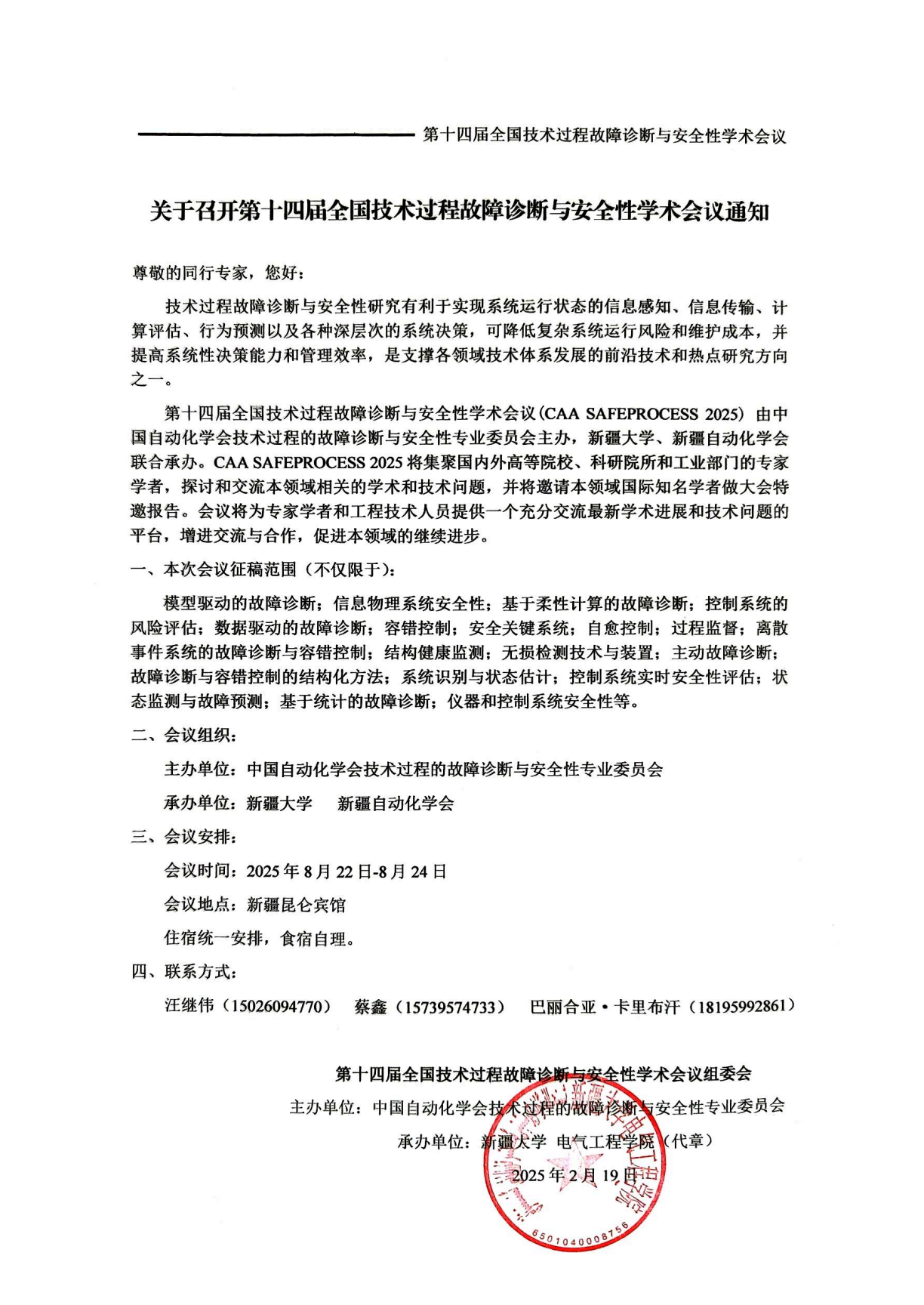 全国技术过程故障诊断与安全性学术会议由中国自动化学会技术过程的故障诊断与安全性专业委员会主办。会议每两年举办一次,旨在为从事相关领域和研究的国内外专家学者和工程技术人员提供一个充分交流最新学术进展和技术问题的平台,增进交流与合作,促进本领域的持续进步。第十四届全国技术过程故障诊断与安全性学术会议(CAA SAFEPROCESS 2025)将于2025年8月22日-24日(周五至周日)召开,地点位于新疆乌鲁木齐市。本次会议由新疆大学、新疆自动化学会联合承办,英国365上市公司、石河子大学、新疆工程公司协办。