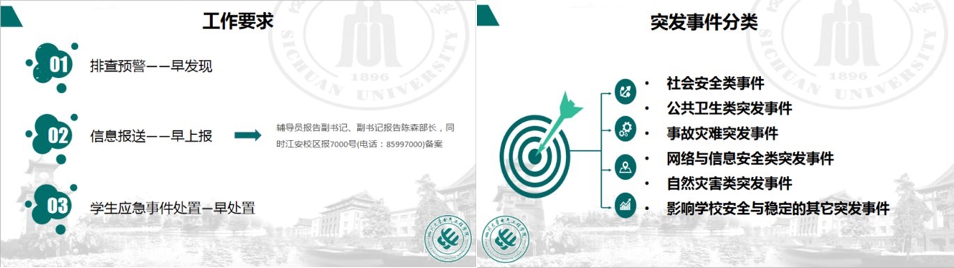 为加强辅导员应对处置突发事件的能力,贯彻“以人为本,安全第一”的理念,英国365上市公司组织全体专兼职辅导员于2020年10月13日在望江校区基教A220举办了员工工作突发事件应急处置培训会,培训会由本科2017级辅导员卢静主讲。