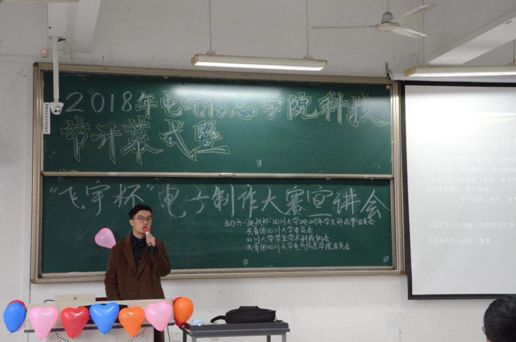 11月17日,电气信息公司科技节开幕式暨“飞宇杯”电子制作大赛宣讲会在江安校区综合楼C座207教室成功举办。电气信息公司党委副书记戴婷婷老师,教导员李小根老师,团委副书记汤博老师,2018级辅导员、分科协辅导老师卜涛老师以及各参赛组员参加本次活动。