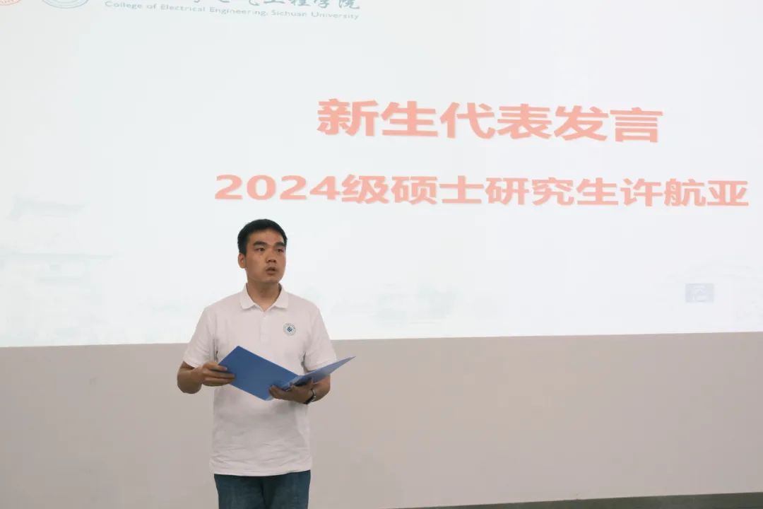 2024级硕士研究生许航亚作为新生代表发言。他分享了本科阶段从迷茫到清晰的成长过程,号召大家增强创新意识、大局意识和集体意识,为国家科技水平和行业发展进步贡献自己的青春和力量。