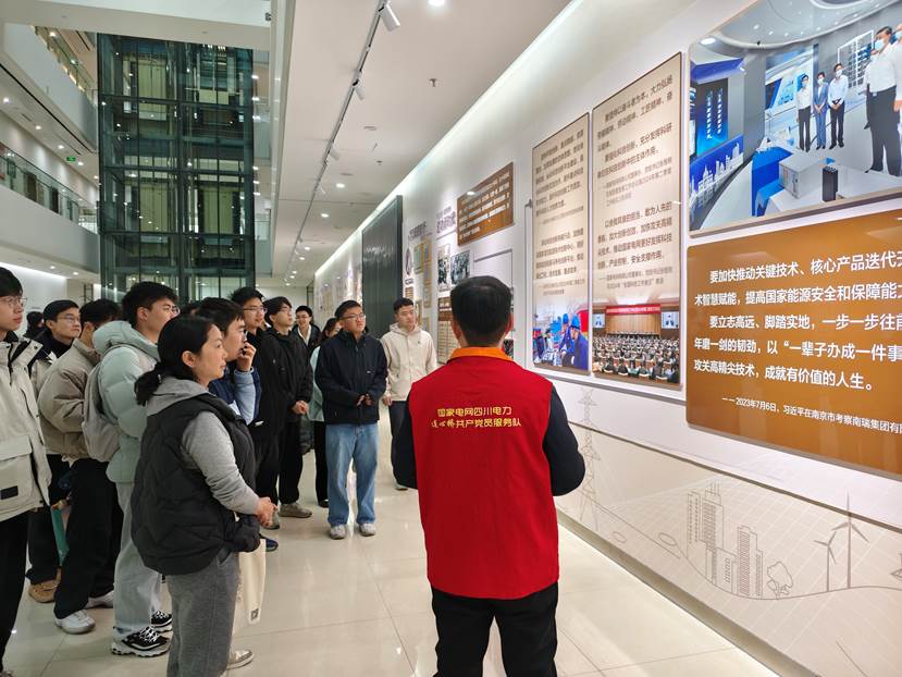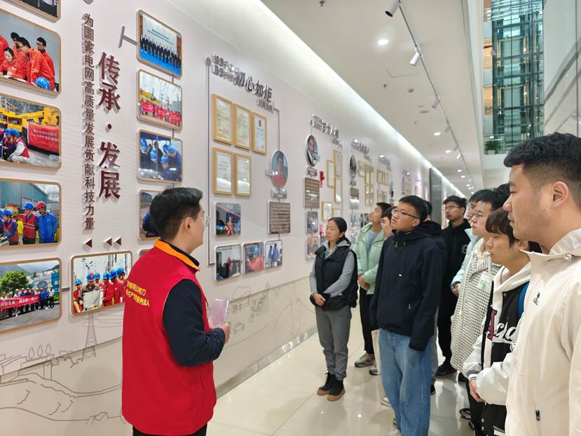 活动伊始,在国网四川电力成都高新连心桥党员服务队成员的引导下,同学们首先参观了“以奋斗者为本”文化墙。展墙上陈列的百余项专利证书与科技奖项无声描摹着电力人扎根西部、服务国计民生的奋斗历程,诉说着电力科技工作者“十年磨一剑”的攻关故事,激励着电气学子以“一辈子办成一件事”的执着为我国电力事业的高质量发展贡献科技力量。