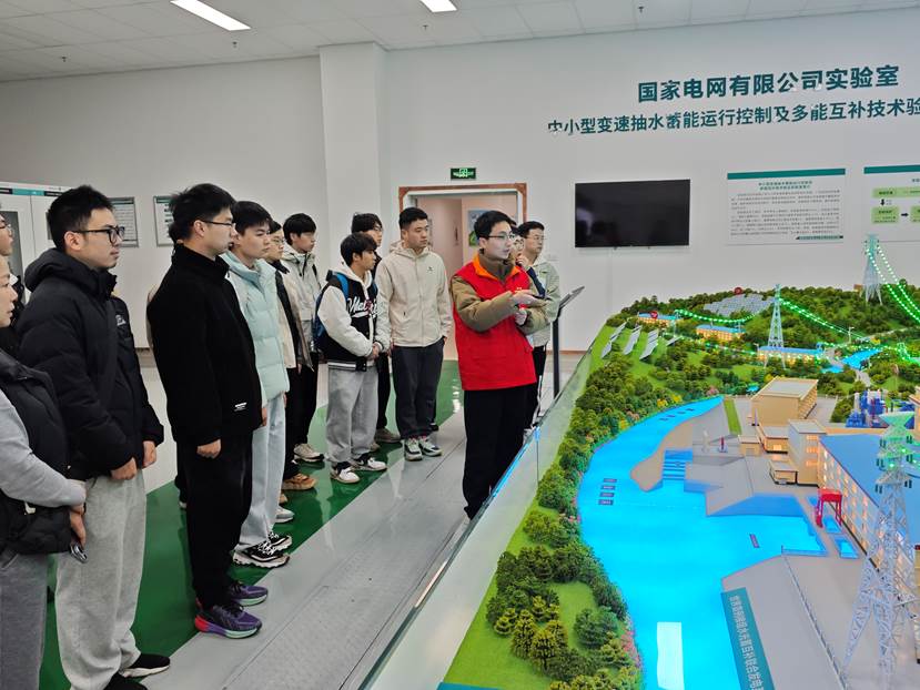 随后,大家前往变速抽水蓄能展厅。依托“中小型变速抽水蓄能运行控制及多能互补技术验证”实验室,同学们通过沙盘模型和图文介绍,深入了解抽水蓄能、水光储多能互补等技术应用场景,深度聚焦全功率变速抽水蓄能机组、梯级水光蓄互补系统等运行控制难题。