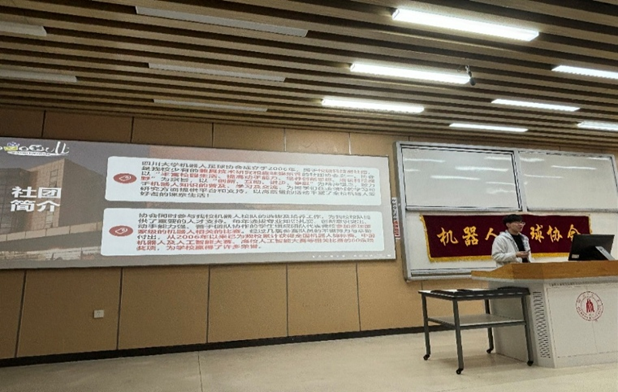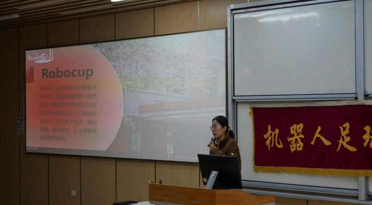 任杰老师随后介绍了2025-2026学年协会学科竞赛相关工作。她首先向在场同学解释了协会重点参与的两项学科竞赛,中国机器人大赛暨RoboCup机器人世界杯中国赛、中国机器人及人工智能大赛的组织形式和参赛流程,并详细介绍了公司为同学们提供的专业技术指导、创新工坊平台与训练设施保障。接着,她为机器人仿真足球联赛开幕,协会自成立以来已累计斩获全国机器人锦标赛、中国机器人及人工智能大赛等90余项国家级奖项,为公司赢得了诸多荣誉,希望协会能够积极创新活动形式,新会员们积极在联赛中锤炼本领,共同为协会续写更辉煌的篇章。