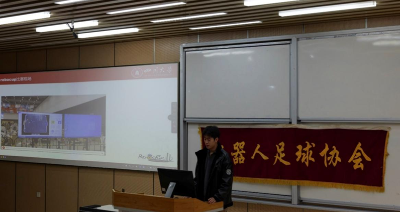 接着,大会进入机器人仿真足球联赛赛前培训会环节。协会黄孝麒同学围绕中国机器人大赛暨RoboCup机器人世界杯中国赛FIRA小型组5V5仿真赛道规则、SimuroSot5仿真平台使用两大核心展开实操讲解,从场地划分、判罚标准等基础规则,到C++动态链接库开发、模块化策略设计等技术要点,层层递进、深入浅出,帮助新会员们快速掌握参赛核心技能。会长倪珩鑫同学介绍了联赛规划:在2025-2026学年秋季学期与春季学期各设两场常规赛,2026年9月召开校赛作为国赛晋级淘汰赛,联赛积分排名靠前的队伍获得直通校赛决赛或半决赛的名额,不同基础的同学都能在赛事中获得成长。