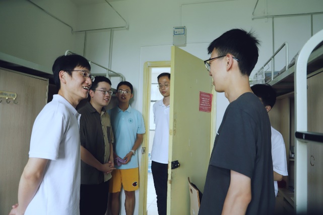 开学第一课结束后,赵昱辉书记与专职辅导员朱愉田、杨龙杰一同走访了新生寝室,并与新生们亲切交流,了解他们的住宿和生活情况。赵书记叮嘱新生们尽快适应老员工活,不仅要认真学习,不断提升自己的专业素养和创新能力,同时也要全面发展,养成良好的生活习惯。