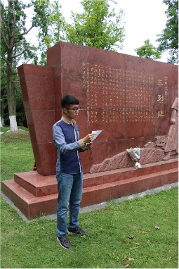 下午一点,英烈碑旁,全体肃立,活动正式开始。首先由魏镜枫同学为烈士献花,并向英烈鞠躬,全体神情庄重。