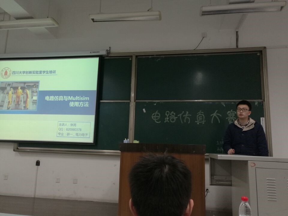 本次宣讲及培训会主要是介绍电路的设计和仿真。本大会于上午9点正式开始。首先,科技中心主持人苟鑫简要介绍了本次比赛的概况和注意事项。接着,在同学们的热情掌声中,主持人邀请研一的科技班主任张芮为大家讲解Matlab的应用。张芮学长首先根据现场大一同学居多的情况,详细地介绍了目前对于大家还很陌生的Matlab的使用方法,并现场操作讲解。然后张芮学长结合自己做的电路介绍具体仿真模拟的几种电路,并为我们分析了这款应用的局限性,让我们更加懂得如何利用它。最后,张芮学长为我们推荐了几种相似的软件,以便我们更深入的进入电路仿真的学习中来。