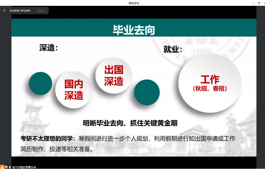会议上,李程老师首先介绍了公司的寒假时间安排与返校后考试及教学的相关注意事项,敦促同学们紧抓毕业设计,多利用寒假时间把握任务进度。之后,李程老师结合2022届毕业生深造、就业去向和数据,引导、帮助2023届毕业生正确认识当前的升学、就业形势,作好进一步规划。李老师向考研同学强调,在成绩公布后一定不要掉以轻心,应积极准备复试,尤其是贴线的同学须提前关注、多渠道收集调剂信息,提高复试、调剂成功率。最后,李老师向参会的同学及家长们表达了感谢,并送上了新春祝福