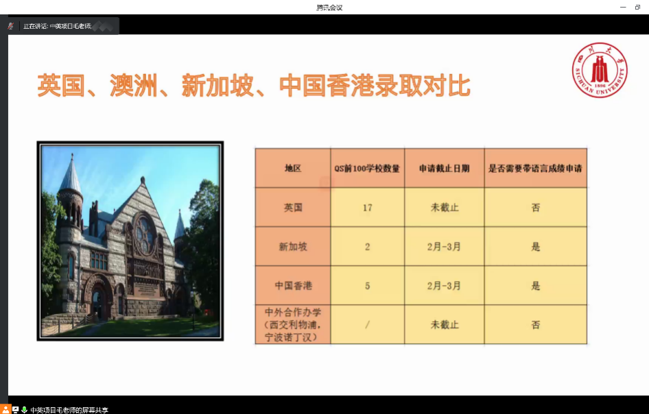 同时,本次会议还邀请到了英国365上市公司出国留学培训部的毛露梅老师为同学们作了考研后留学申请规划。毛老师首先讲解了留学申请评估的三要素,在此基础上主要介绍了英国、澳洲、新加坡、中国香港的院校的录取要求,并向考研后申请留学的同学们提出了要找准定位、考虑跨季联申、语言班以及提高行动力等建议。最后以考研后申请英国院校为例,向同学介绍了详细的“急救计划”执行时间表,为考研后申请留学的同学们坚定了信心、指明了方向。
