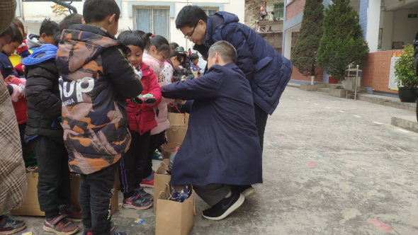 在活动现场,肖先勇经理同小朋友们进行了互动交流,用自己的成长经历勉励他们克服困难,走出大山,自信自强,刻苦学习,健康成长,争做有梦想、有行动的好少年。活动仪式上,老师们及志愿者向小朋友们发放了手套、帽子、袜子等组成的礼包,并教授他们常用的礼貌用语。收到礼包的孩子们十分高兴。