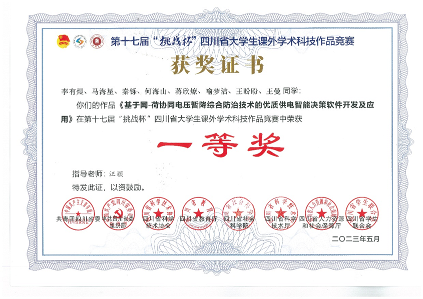 公司获奖项目《基于网-荷协同电压暂降综合防治技术的优质供电智能决策软件开发及应用》,指导老师为汪颖教授,团队负责人为李有煜,团队成员包括:马海星、秦烁、何海山、蒋欣燎、喻梦洁、王盼盼和王曼同学。获奖团队依托电能质量与电磁环境学省级重点实验室,致力于解决困扰敏感用户的电压暂降问题,构建网-荷协同的电压暂降综合防治技术体系,开发了优质供电智能决策软件,在国内多个省市得到广泛应用。