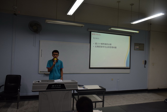 院团委员工会各执行副主席依次上台发言,按自己的工作重心提出建设性意见。执行副主席白健就活动推送、礼仪、新闻工作及海报审核等方面做了详细介绍,执行副主席朱愉田申明了报账、开发票流程及注意事项,执行副主席黄瑞杰围绕怎样带好干事做了几点指导,执行副主席郎喜文就工作态度问题与在座者展开探讨。执行员工团委副书记郝思宇同学针对建立干事档案和近期员工会的管理问题作出妥善安排。