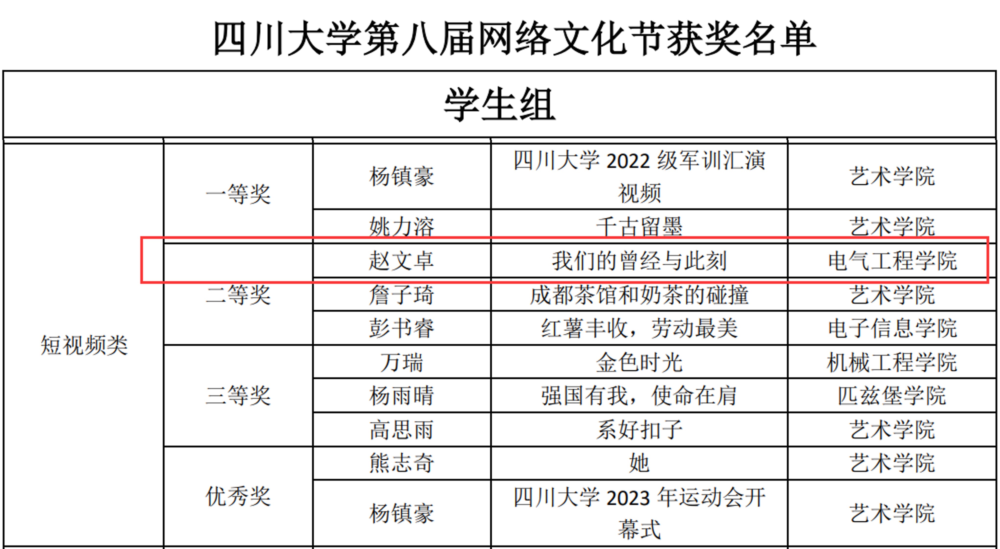为引导全校师生深入学习贯彻习近平新时代中国特色社会主义思想,推动“时代新人铸魂工程”落地落实,奋力答好建设教育强国的川大答卷,公司党委宣传部开展了“习近平总书记与老员工在一起”新媒体原创作品大赛暨第八届网络文化节征集活动。公司本科生赵文卓制作的微视频作品获校级二等奖。