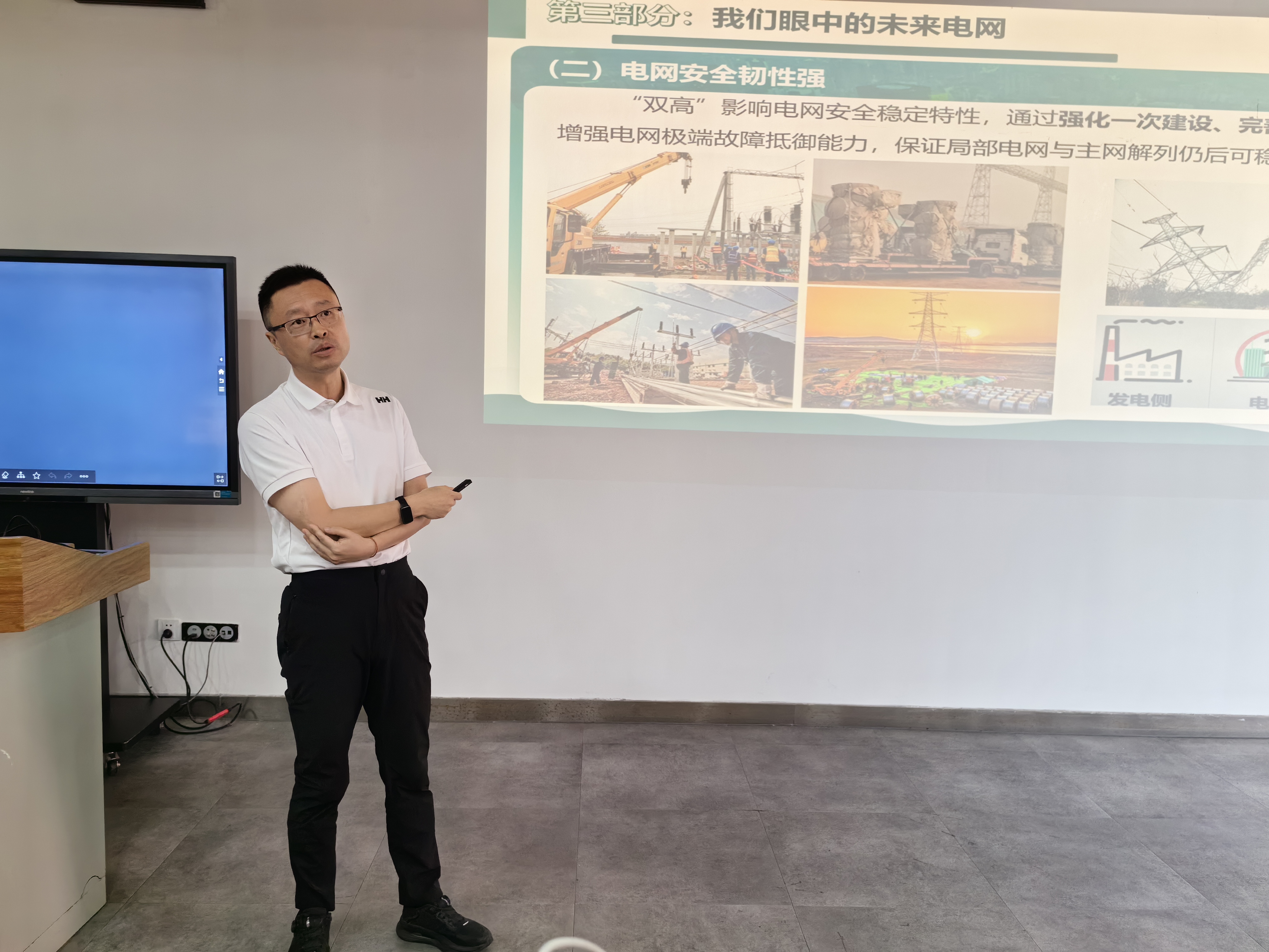 胡翔老师结合课程主要内容为同学们详细讲解了电网调度运行管理日常工作,与电网运行监视、状态估计、安全分析等调度自动化技术的实际应用情况,并从认识电网,管理电网,未来电网三个方面分析了调度管理工作在新型电力系统中面临的挑战和应对的方法。他指出,当西南电网异步运行后,会出现电网灵活性降低,频率安全风险加大,超低频振荡风险加剧等问题,并提出了风险应对措施与防御体系。胡老师根据多年从业经验总结出,解决任何工程问题都需要未雨绸缪,开展特性认知,预知安全风险,做好预案管理。