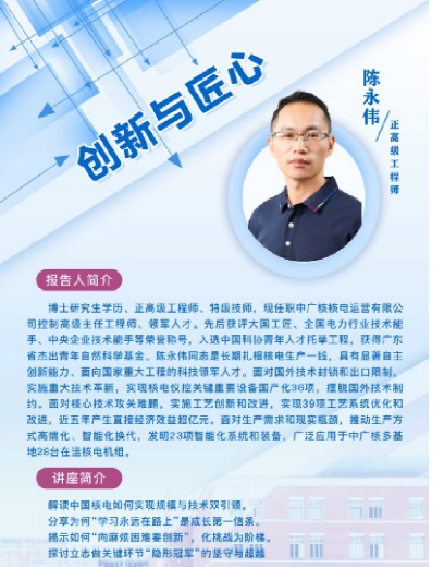 陈永伟博士首先立足行业高度,解读了中国核电如何实现规模与技术的双重引领。作为长期扎根核电生产一线、先后获评“大国工匠”、“全国电力行业技术能手”的科技领军人才,陈博士结合自身经历,讲述了面对国外技术封锁和出口限制时,中国核电人如何实施重大技术革新,实现核电仪控关键重要设备国产化36项、摆脱国外技术制约的奋斗历程。