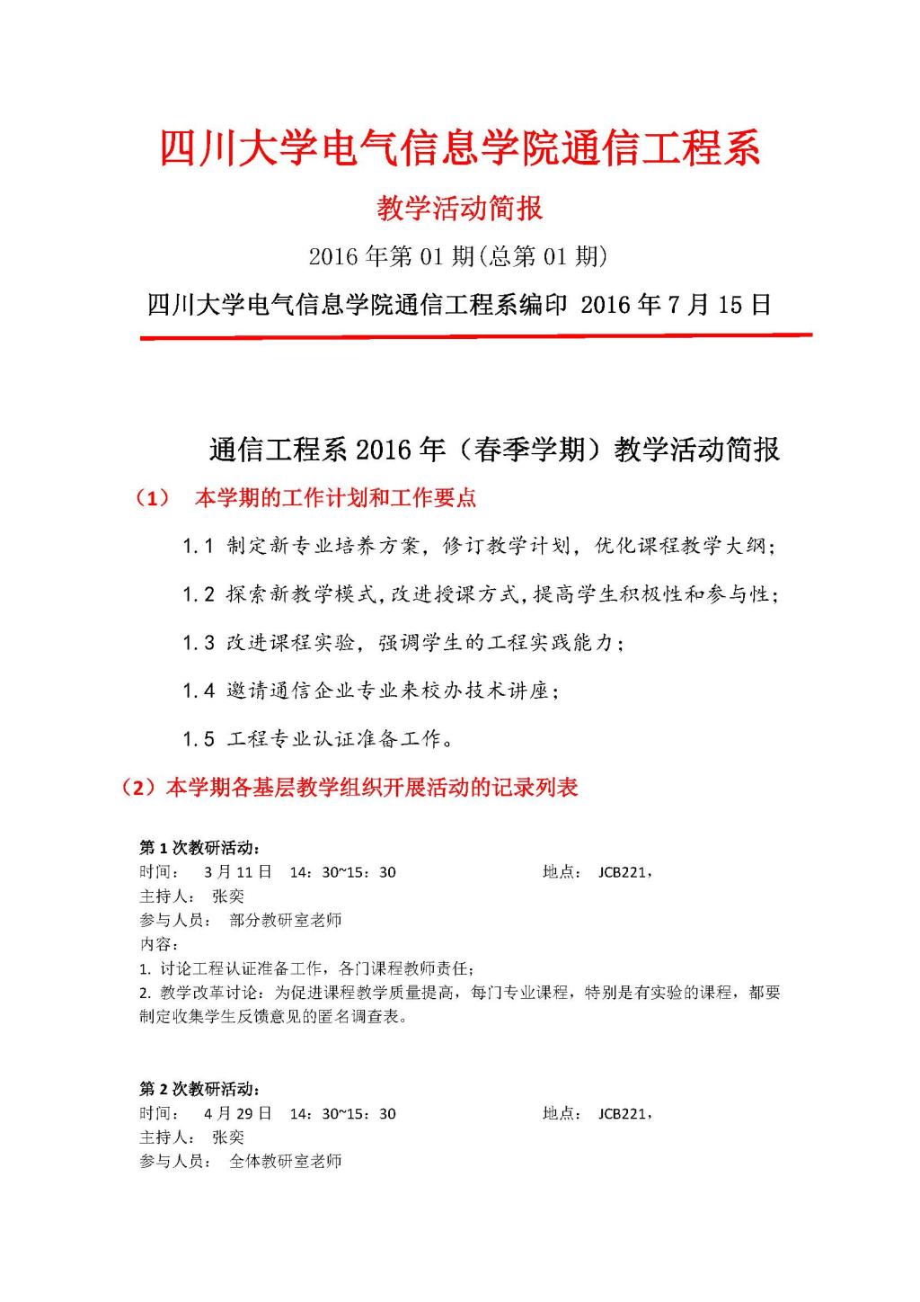 通信工程2016年(春季学期)教学活动简报