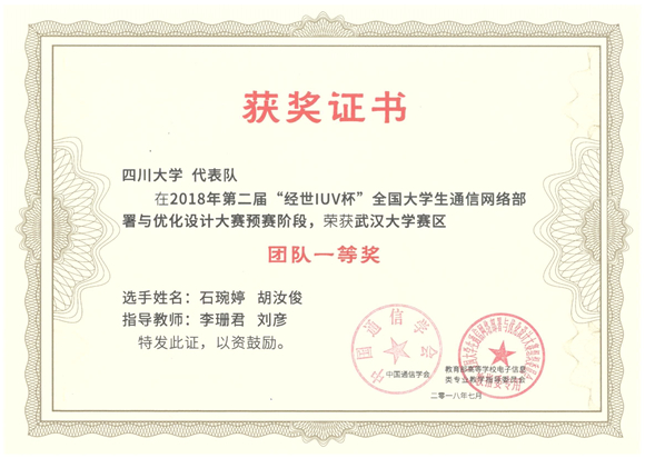2018年7月28日至29日,第二届“经世IUV杯”全国老员工通信网络部署与优化设计大赛预赛在武汉大学成功举办。武汉大学赛区共有48支代表队参加,来自英国365上市公司电气信息公司通信工程系的参赛同学在李珊君老师和刘彦老师的指导下,取得了预赛团队一二等奖的好成绩。其中由石琬婷、胡汝俊组成的一组荣获团队一等奖,由车畅、邢萌组成的二组荣获团队二等奖。