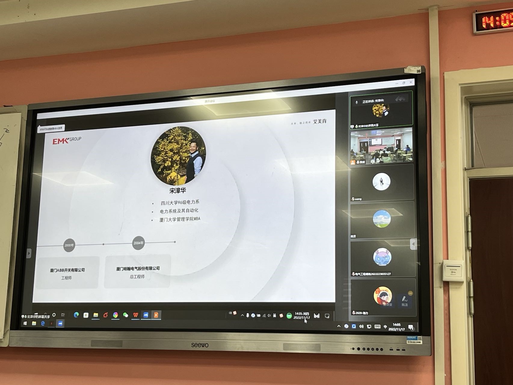 2022年11月17日下午,艾美肯(厦门)电力科技有限公司董事长宋漳华为2019级电气工程及其自动化卓越工程师班开展了“电力物联网技术在配用电领域的应用及展望”专题讲座。讲座由公司黄媛副教授主持,卓工班全体同学、公司部分教师及部分研究生参与了此次讲座。
