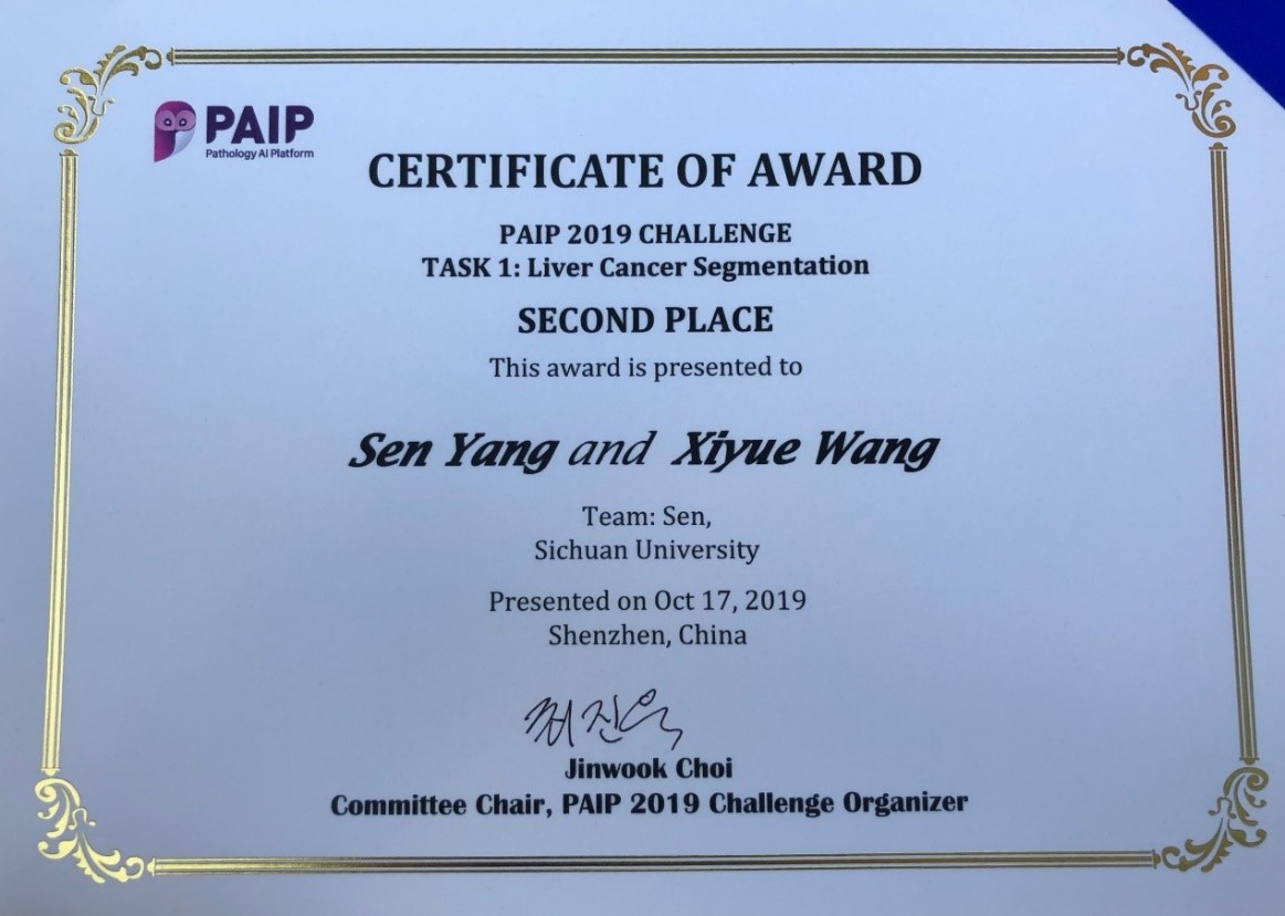 10月13日至17日,国际顶级医学影像学术会议MICCAI 2019在深圳举行。在MICCAI 2019肝癌病理图像分割国际挑战赛中,在公司自动化系张劲老师和腾讯AI医疗中心专家研究员韩骁老师的指导下,公司硕士研究生杨森和王熙月组成的团队编写的人工智能算法,荣获 MICCAI PAIP 2019 Challenge:Liver Cancer Segmentation 第二名。