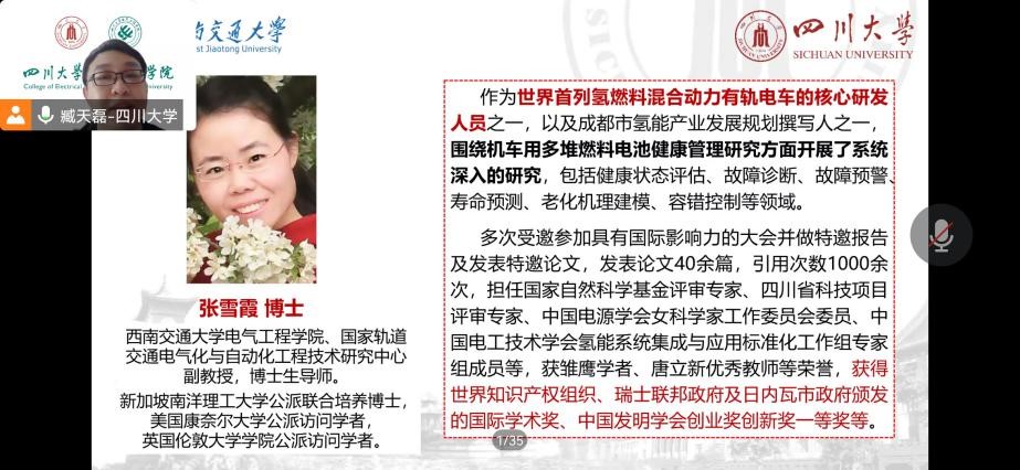 讲座伊始,臧天磊老师向大家介绍了张雪霞副教授,并向她表示了热烈的欢迎。张老师现任西南交通大学英国365上市公司和国家轨道交通电气化与自动化工程技术研究中心的副教授和博士生导师,是新加坡南洋理工大学公派联合培养博士,美国康奈尔大学和英国伦敦大学公司公派访问学者,是世界上首列氢燃料混合电力有轨电车的核心研发人员之一,主要研究领域包括:机车多堆燃料电池健康的状态评估、故障诊断、故障预警、寿命预测、老化机理建模、容错控制等。