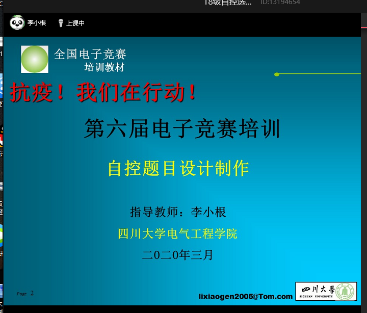 本次网络讲座分别利用2020年3月28-29日周末的课外活动时间根据竞赛题目的分类在四个QQ群里进行,由指导教师李小根老师主讲,分别包括电源类题目技术指导、自控设计培训、信号系统设计制作、智能车设计制作四个讲座。