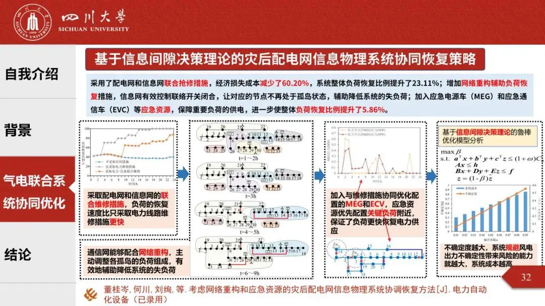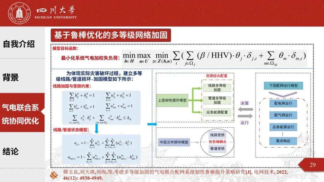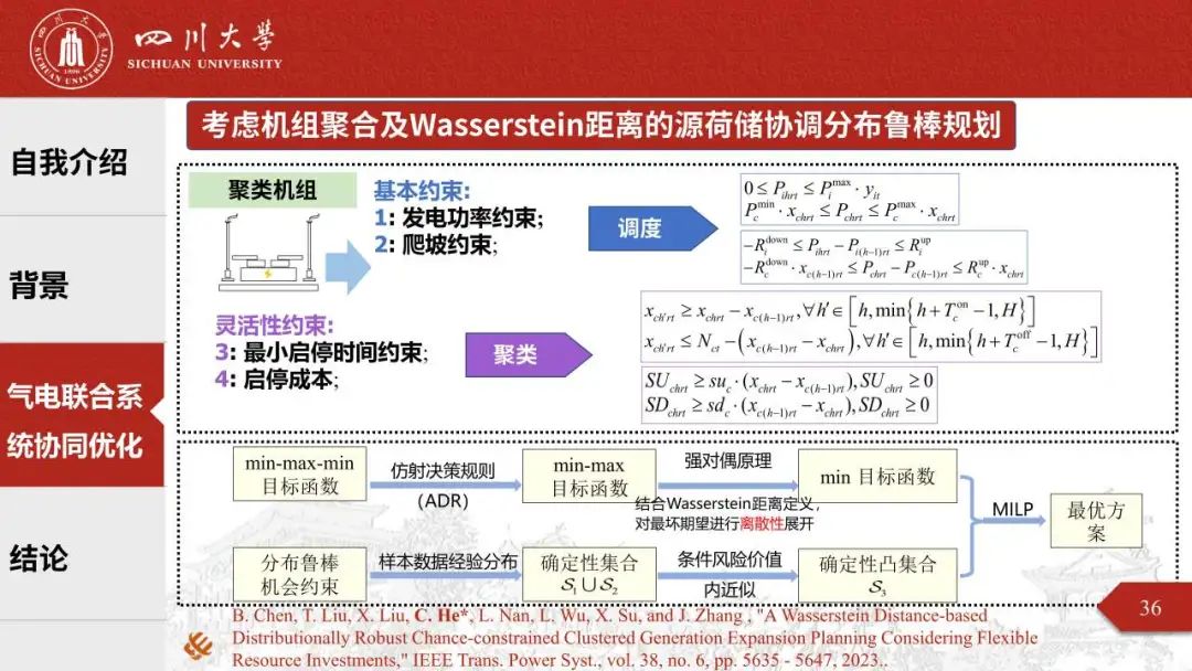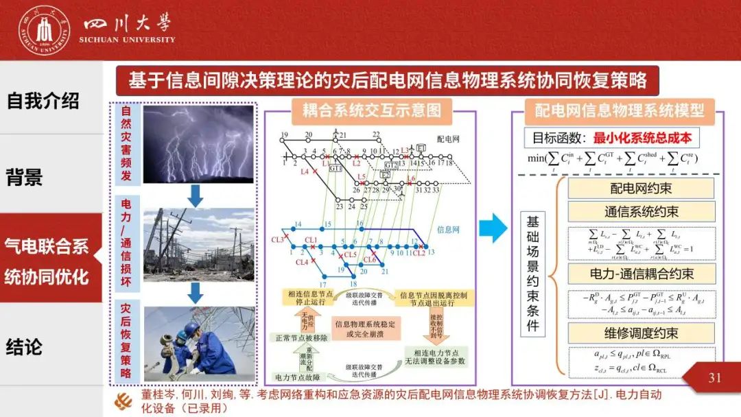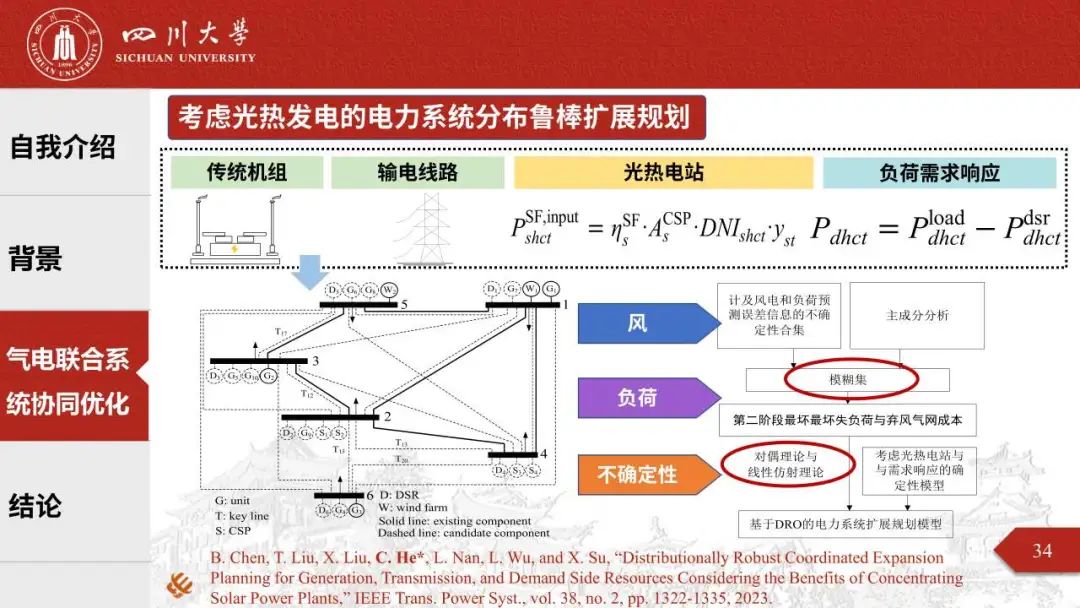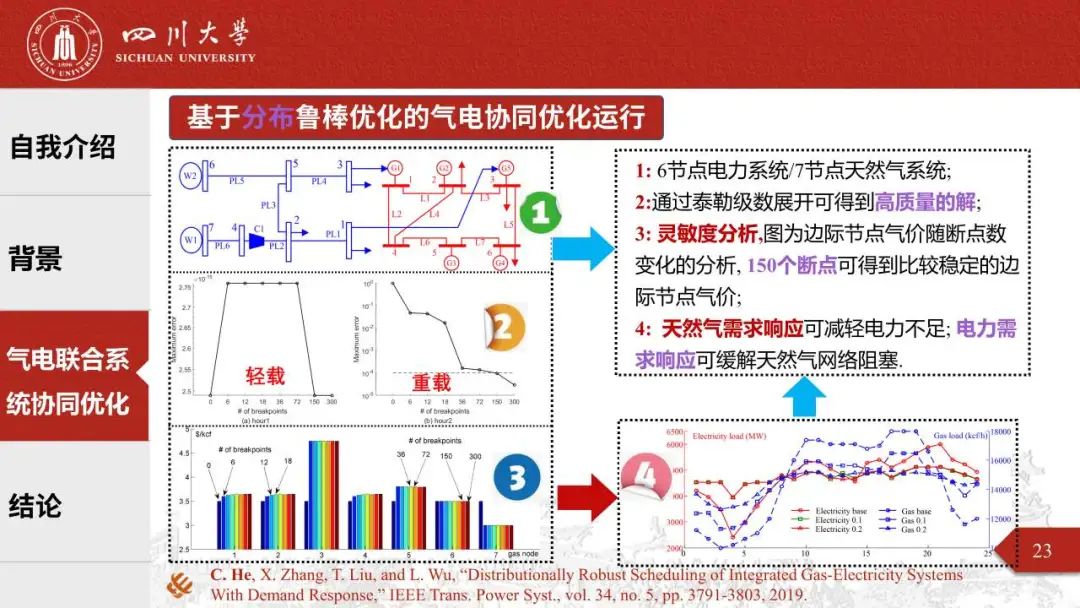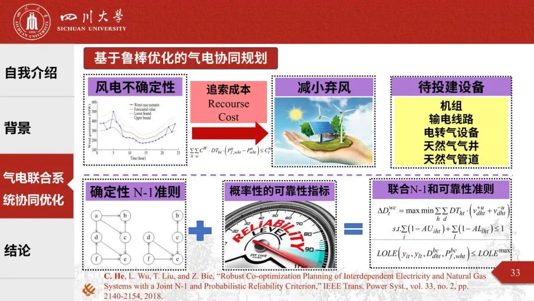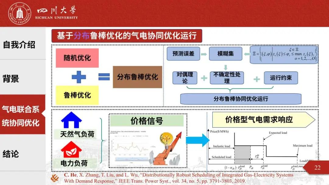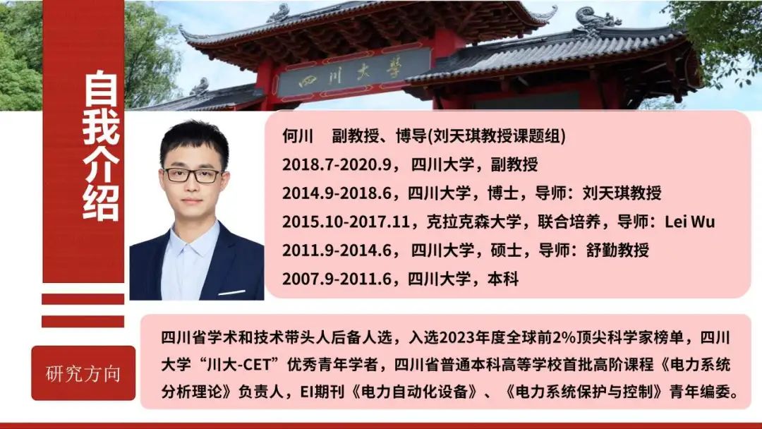 何川副教授:博士生导师,四川省学术和技术带头人后备人选,入选2023年度全球前2%顶尖科学家榜单,英国365上市公司“川大-CET”优秀青年学者”,四川省普通本科高等公司首批高阶课程《电力系统分析理论》负责人,EI期刊《电力自动化设备》、《电力系统保护与控制》青年编委,期刊《宁夏电力》编委。长期从事电力系统与气电联合系统设计规划和优化运行相关的研究工作,总计发表论文60余篇,其中以第一作者/通讯作者身份发表21篇SCI论文、16篇EI论文, H因子为14,在Web of Science中被他引1052次,1篇ESI高被引论文。主持国家自然科学基金青年项目1项、面上项目1项,省部级项目3项。