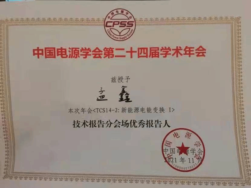 公司孟鑫老师受邀作题为《一种具有高电能质量的大功率高效电解质制氢整流电源》的报告,并获“技术报告分会场优秀报告人”奖;王学庆老师受邀作题为《多相组交流永磁电机系统功率变换与调控方法》的专题讲座;此外,周群、贺明智、刘雪山、周述晗等老师通过论文投稿的方式参加了会议。