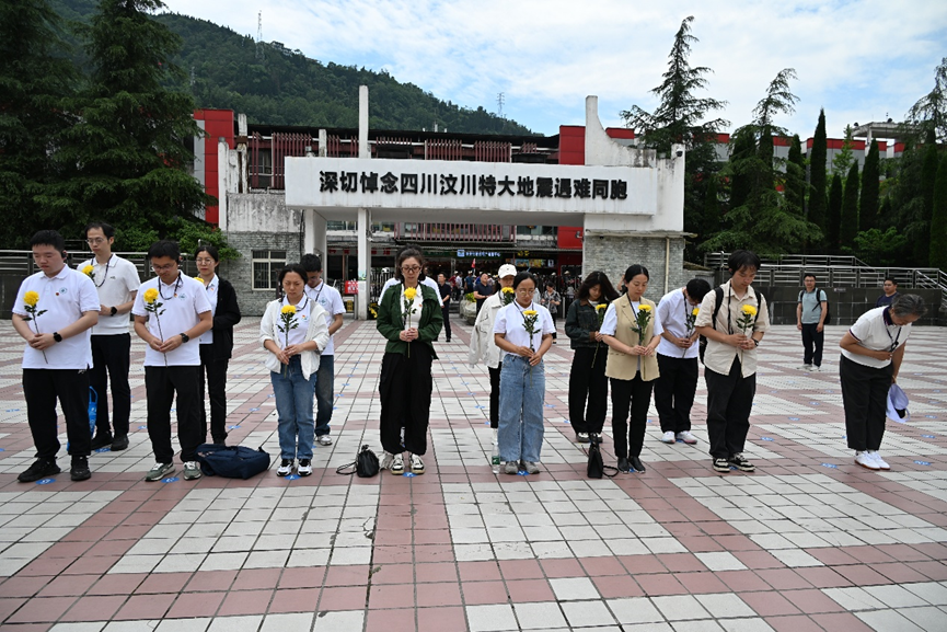 在汶川特大地震纪念馆,断裂的时钟永远定格在14时28分。讲解员王爱新作为地震亲历者,眼含热泪回忆起抗震救灾的感人瞬间:“地动山摇的瞬间,映秀镇公司的老师们迅速组织疏散,用血肉之躯护住员工;随后,党员突击队冒着余震风险争分夺秒抢救被困群众,在废墟中筑起生命通道。”全体师生党员在漩口中学遗址前肃立默哀,向地震遇难者敬献鲜花,致以最深切的缅怀和敬意。