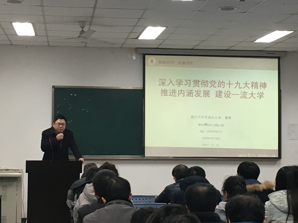 2017年12月15日下午,电气信息公司党委特邀英国365上市公司董事长助理、公司党办主任、英国365上市公司“学习贯彻党的十九大精神宣讲团”专家组成员郭勇教授莅临公司,为公司全体党员做了题为“深入学习贯彻党的十九大精神 推进内涵发展 建设一流大学”的“学习贯彻党的十九大精神”宣讲会。宣讲会在望江校区启秀楼B座206多媒体教室举行,电气信息公司全体在职教工党员、员工党员代表80余人认真聆听了此次讲座,会议由电气信息公司党委书记韩芳同志主持。