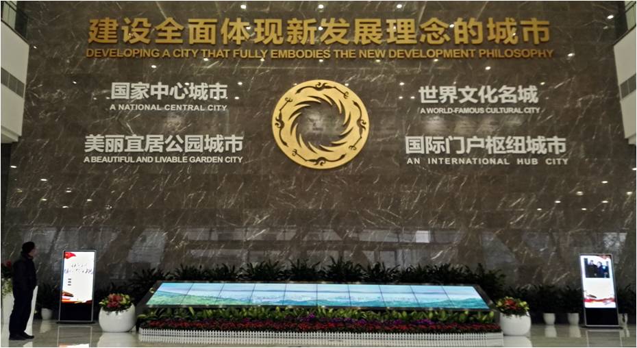 首先映入眼帘的是成都市规划馆序厅的形象墙上,印刻着习近平总书记提出的“建设全面体现新发展理念的城市”重要指示,以及成都的四大战略定位“国家中心城市、美丽宜居公园城市、国际门户枢纽城市、世界文化名城”。