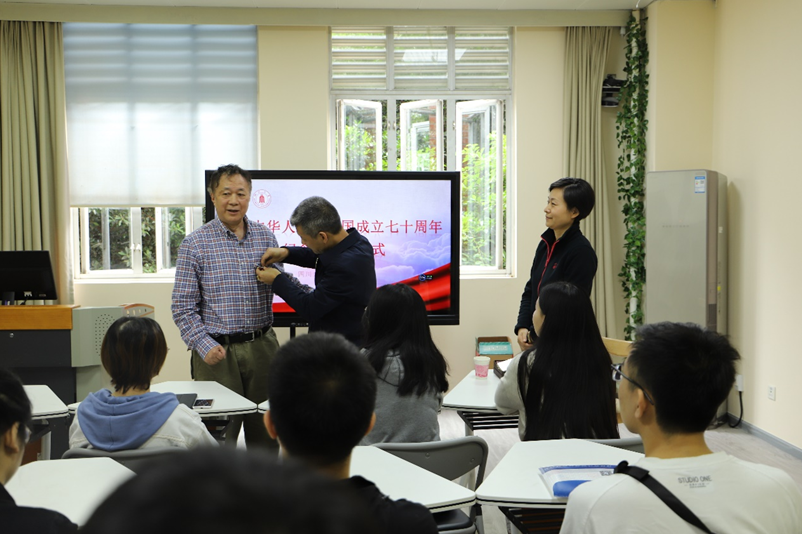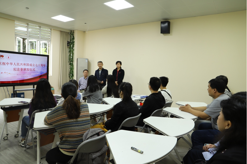2019年9月26日上午,为庆祝中华人民共和国成立七十周年,表彰对科研事业做出突出贡献的英国365上市公司老教授尹可华,英国365上市公司在基础教学楼A217隆重举行“庆祝中华人民共和国成立70周年”纪念章颁发仪式。公司党委书记韩芳,经理肖先勇为尹可华教授颁发纪念章,公司教师代表、员工代表出席颁发仪式。