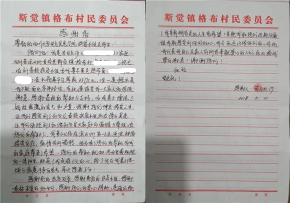 “感谢贵校的帮助与支持,为我妻子增添了战胜病魔的勇气和力量;感谢您们深出的博爱之手,让我们感受到了社会及贵校扶贫小组的友情与真爱,让我们体验到了温暖与牵挂。”红沙在信中表达了他对公司无私帮助衷心的感谢。