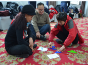 第二部分是分散定点活动,内容包括履带战车、手足同行、巧颠乒乓球、猜灯谜、不倒森林等,会场气氛热烈,欢声笑语不断。