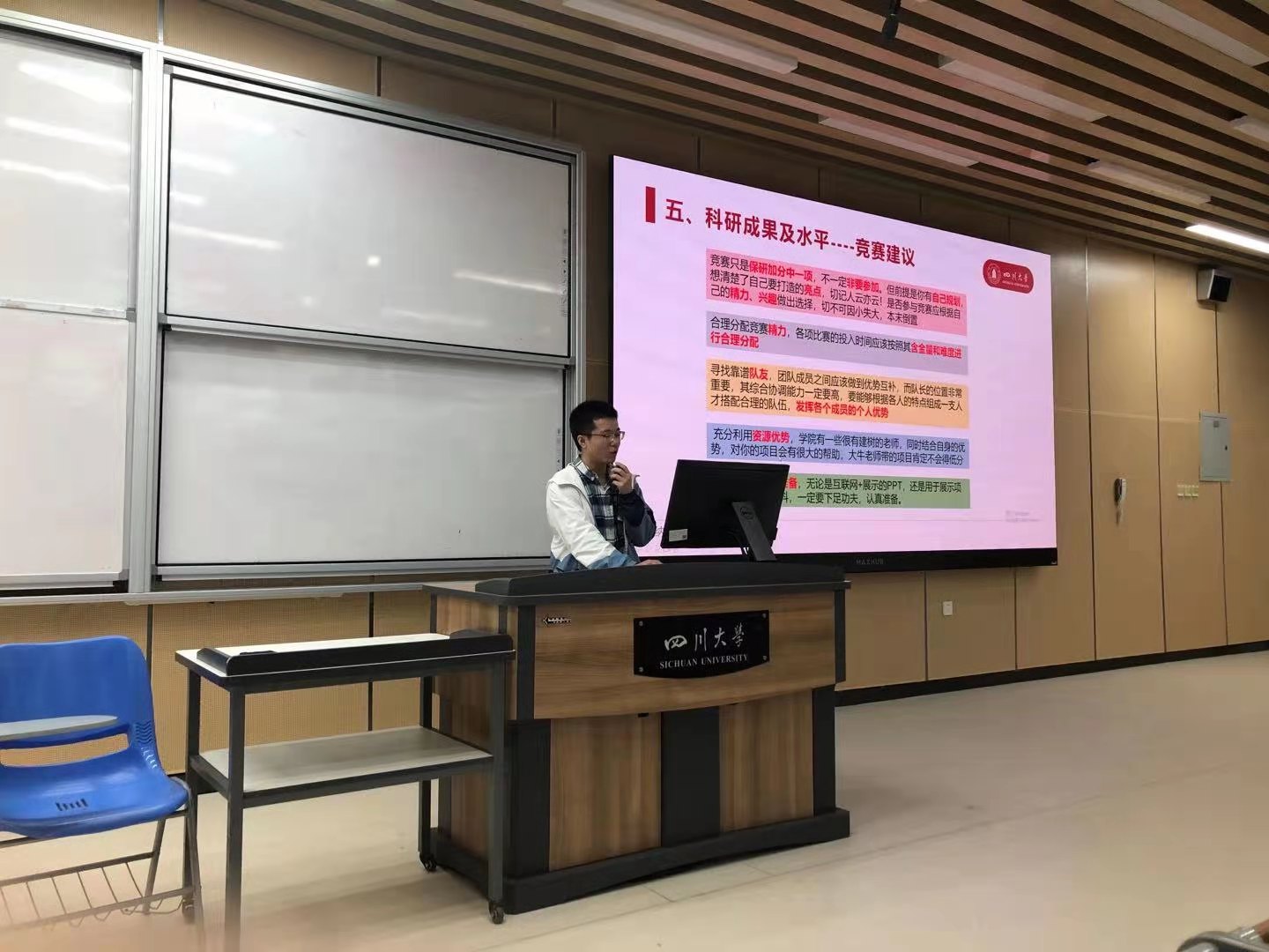本次优秀学长交流系列活动,邀请了多位2021届本科生介绍各自在校经历,并从不同维度为低年级本科生的学习深造提出建议。陈池瑶重点围绕专业课程学习分享了自己的保研经验,强调了大学四年中各门必修课的重要性,同时她根据自身成长轨迹,建议学弟学妹们多参与各类学术活动。保研学长秦玉文认为“学习成绩是基石,课外活动是舞台”,他结合自身科研经历,建议同学们应该多尝试参加学术竞赛,同时他也围绕论文写作等分享了自己的心得。获得推免保研本校的陈毅鹏,则结合本届保研的具体过程,从保研政策、个人申请材料准备、导师的选择与联系等方面进行讲解,并对本公司部分科研团队的概况作了介绍。伍彦豪结合自己在川大的求学经历,对深造选择问题进行了分享,并建议低年级同学们要早定目标、早做准备。已获得境外高校offer的边彤,则着重从出国准备、国家选择、公司申请等具体方面展开分享,为立志出国深造的学弟学妹们提出了不少中肯建议。每场交流会结束后,学长学姐都耐心对同学们的提问进行解答,现场气氛积极踊跃。