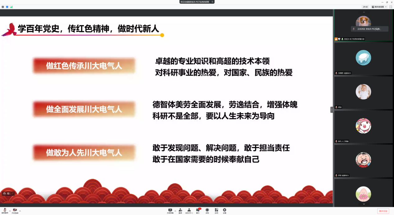 吴恒帅向同学们分享道,当代青年应“学百年党史”,从中“传红色精神”,而后“做时代新人”。她围绕“科研事业”、“全面发展”和“敢为人先”三个方面对2021级新生发出号召,同时表达了党史学习教育的深刻意义、重点和学习要求。