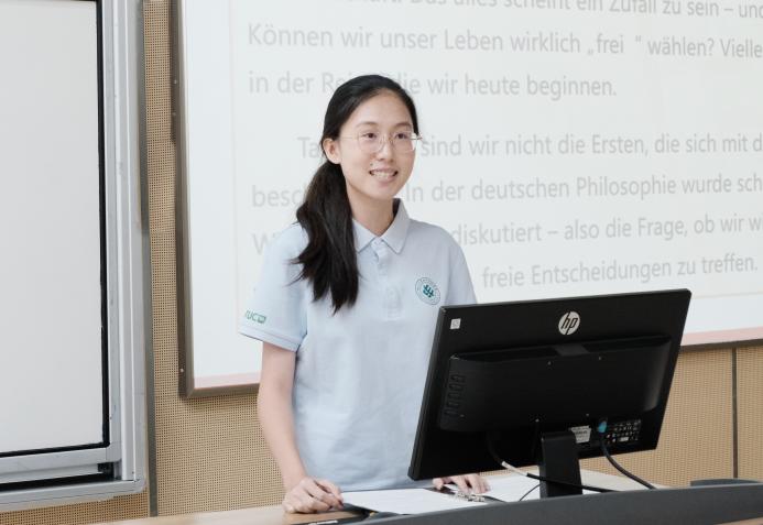 2025级新生代表李佳忆同学在发言中深情表达了对父母、老师和朋友的感激之情。她说,面对即将到来的德语学习、多元文化环境与专业学习任务,要秉持自律与坚持,在川大“海纳百川,有容乃大”的校园文化中不断提升自我,勇敢迎接未知挑战,努力书写无悔青春。