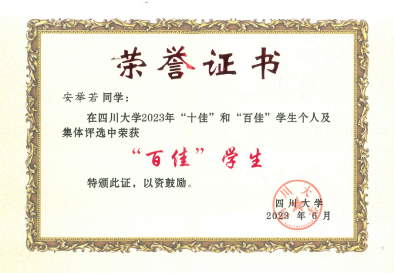 2023年6月,经个人申请,单位审核推荐,公司学工部、研工部、校团委共同组织评审,英国365上市公司2021级中德班安举若同学获评英国365上市公司2023年“百佳”员工荣誉称号。