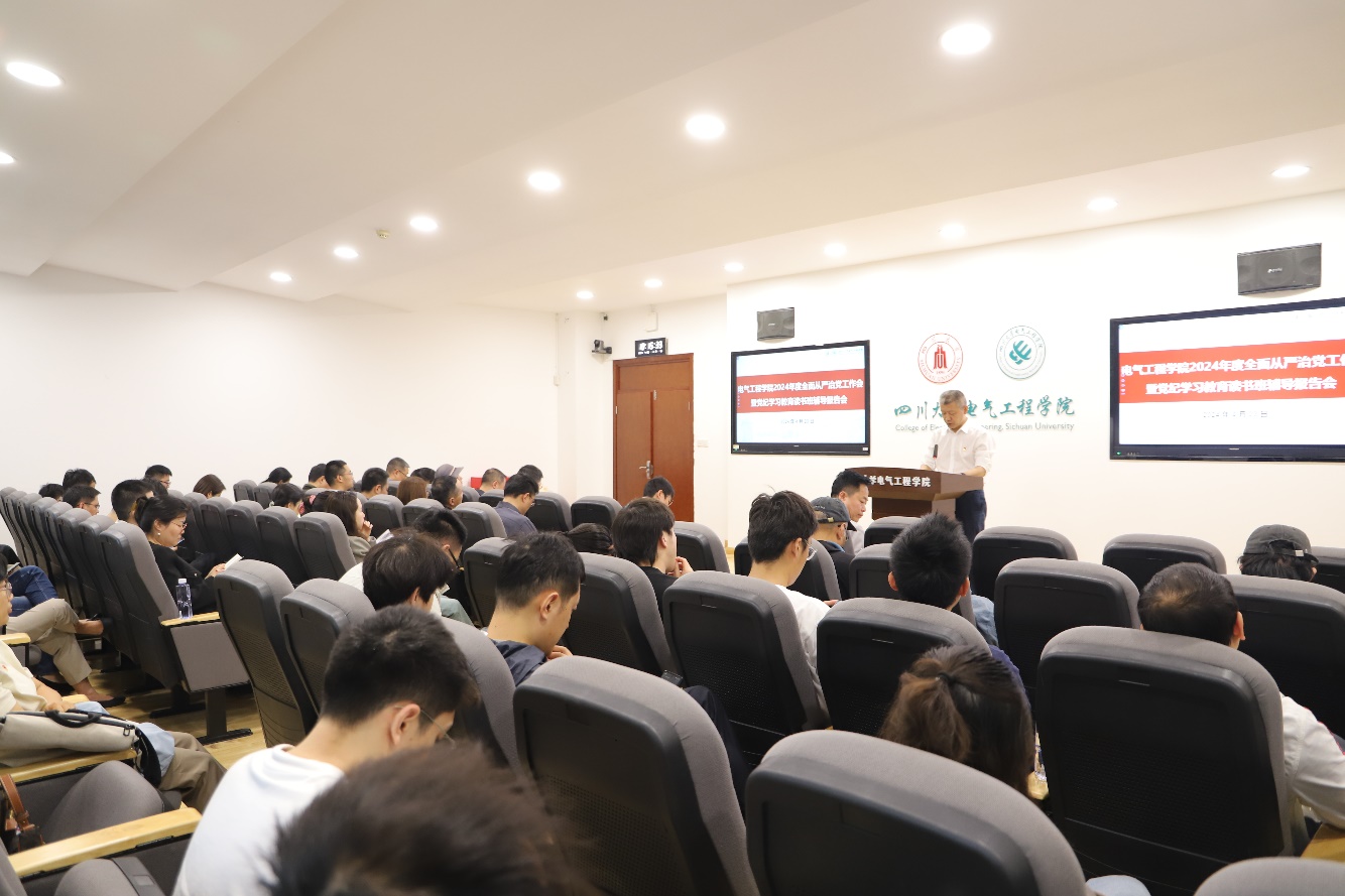 4月23日,公司在基础教学楼报告厅召开2024年度全面从严治党工作会暨党纪学习教育读书班辅导报告会。公司领导班子成员,两委委员,科室、系(所、中心)负责人,党支部书记,在职教职工党员、离退休教职工党员、员工党员代表等参加会议。公司经理肖先勇主持会议。