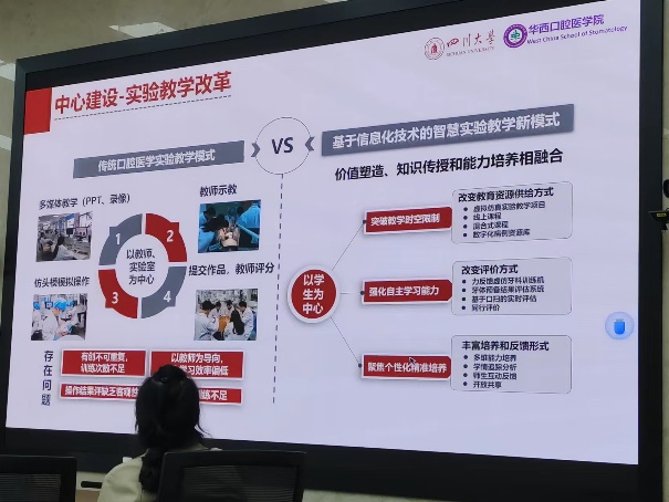 交流会上,华西口腔医公司教学实验室主任郑庆华副教授对实验教学中心建设现状进行了介绍,并提出了“学科引领,信息赋能”的中心发展思考。岳莉、游梦和谢蟪旭老师分别从数字化赋能、数字图像教学资源平台建设和虚拟仿真项目建设应用等方面分享了实验教学示范中心的宝贵建设经验。